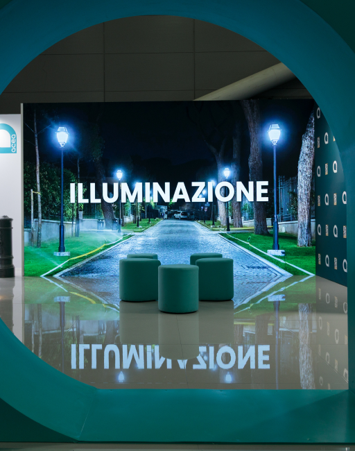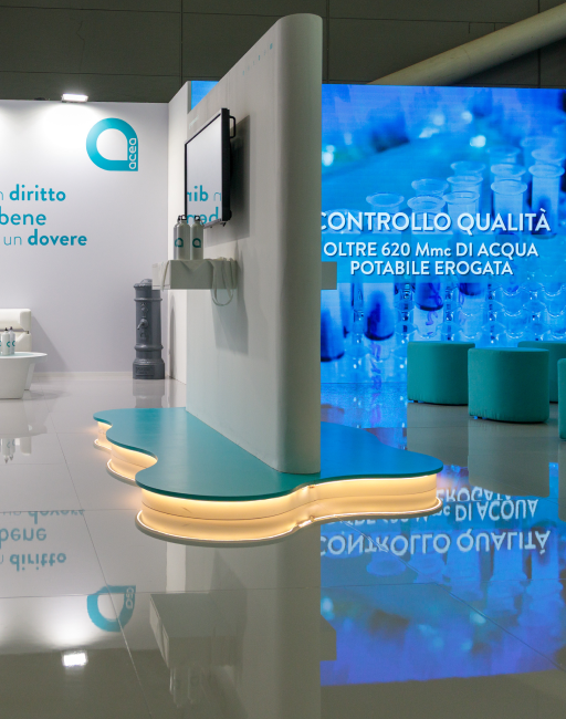 Lo stand Acea presenta corner tematici per aree di business che presentano e raccontano progetti, expertise e know how attraverso spazi espositivi e supporti video dedicati all'Acquedotto del Peschiera e l'illuminazione artistica