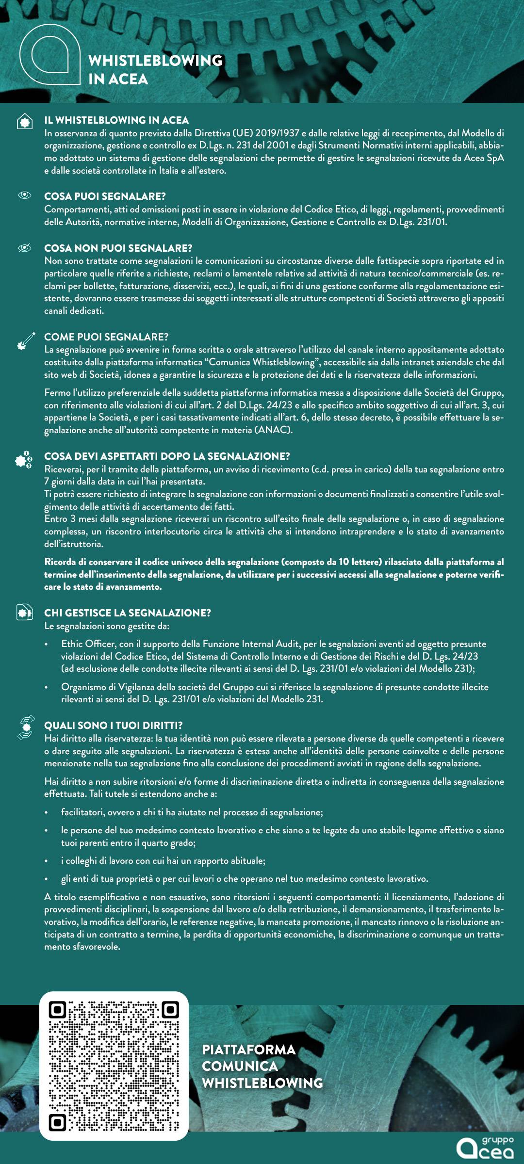 Le segnalazioni relative a presunte violazioni del Codice Etico e della Policy sui diritti umani, del Sistema di Controllo Interno e Gestione dei Rischi (SCIGR) e del D.lgs. 24/2023 di Acea e delle sue società controllate sono trasmesse all’Ethic Officer, un organo collegiale autonomo dedicato alla relativa gestione, in qualità di soggetto interno per Acea SpA e soggetto esterno per le singole società controllate dell'azienda.
